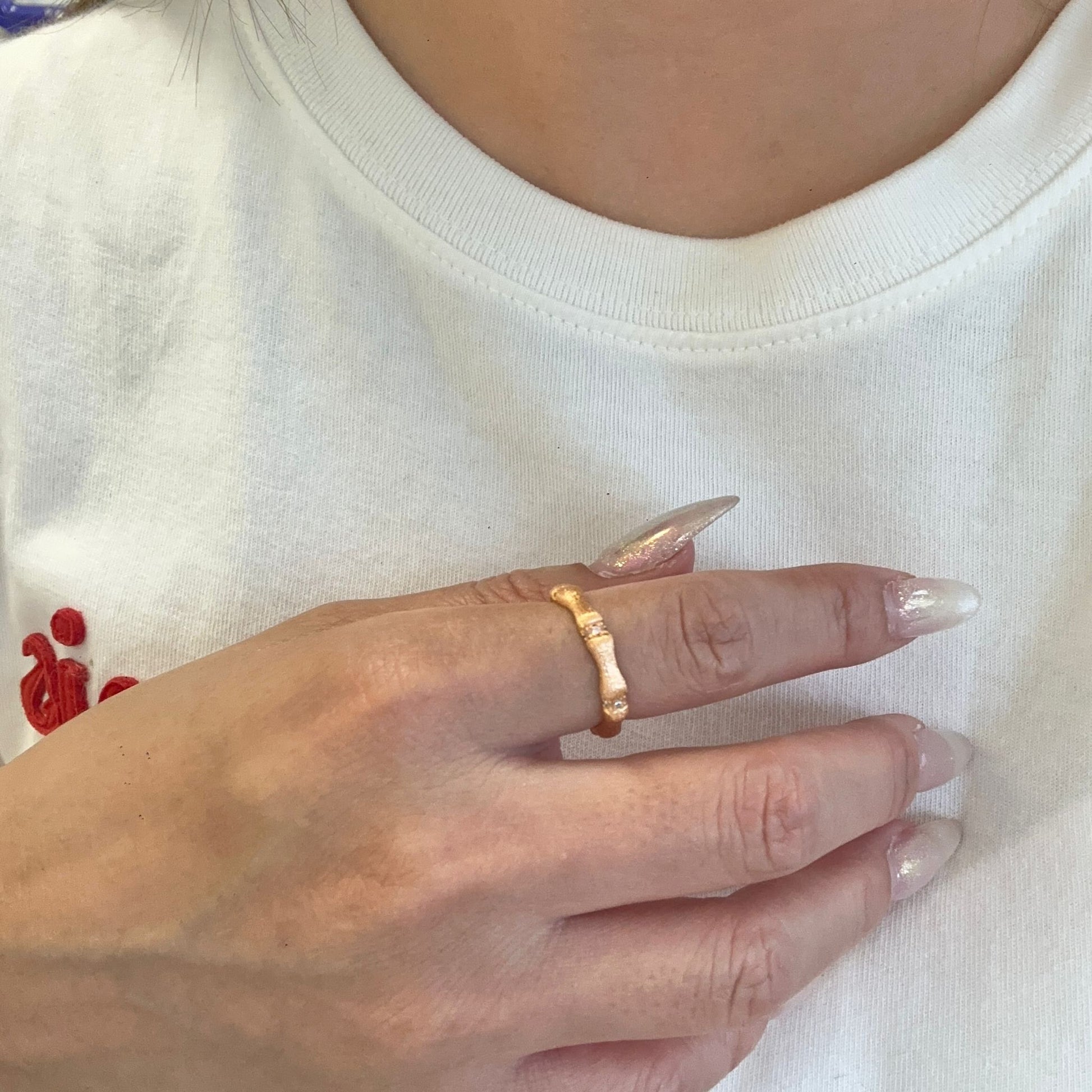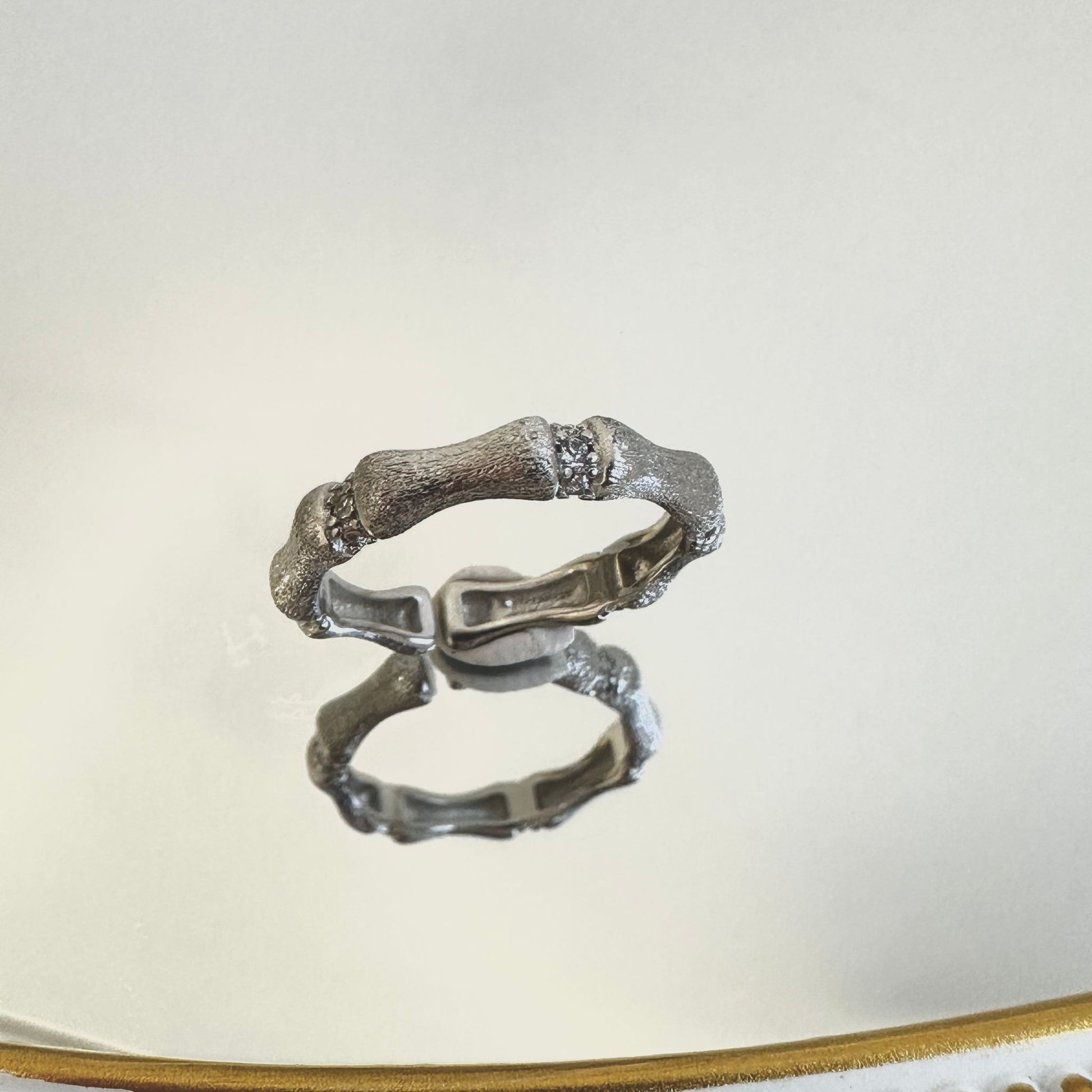 Inspired by the graceful lines of bamboo, this ring features a unique textured finish created with a delicate brushed technique. The surface is soft to the touch with a matte luster that mimics natural bamboo grain.