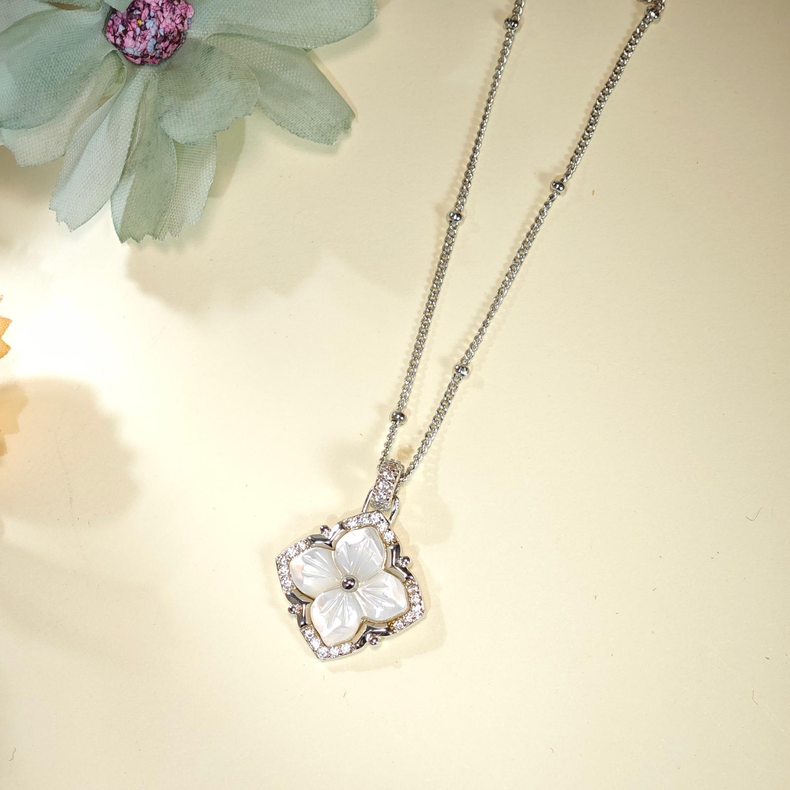 An elegant necklace featuring a delicately carved mother-of-pearl flower, framed by sparkling stones for a refined and feminine look. The soft iridescent glow of the natural shell captures light beautifully, adding a touch of elegance to any outfit. Perfect for everyday wear or special occasions, this timeless design is available in both gold and silver tones.