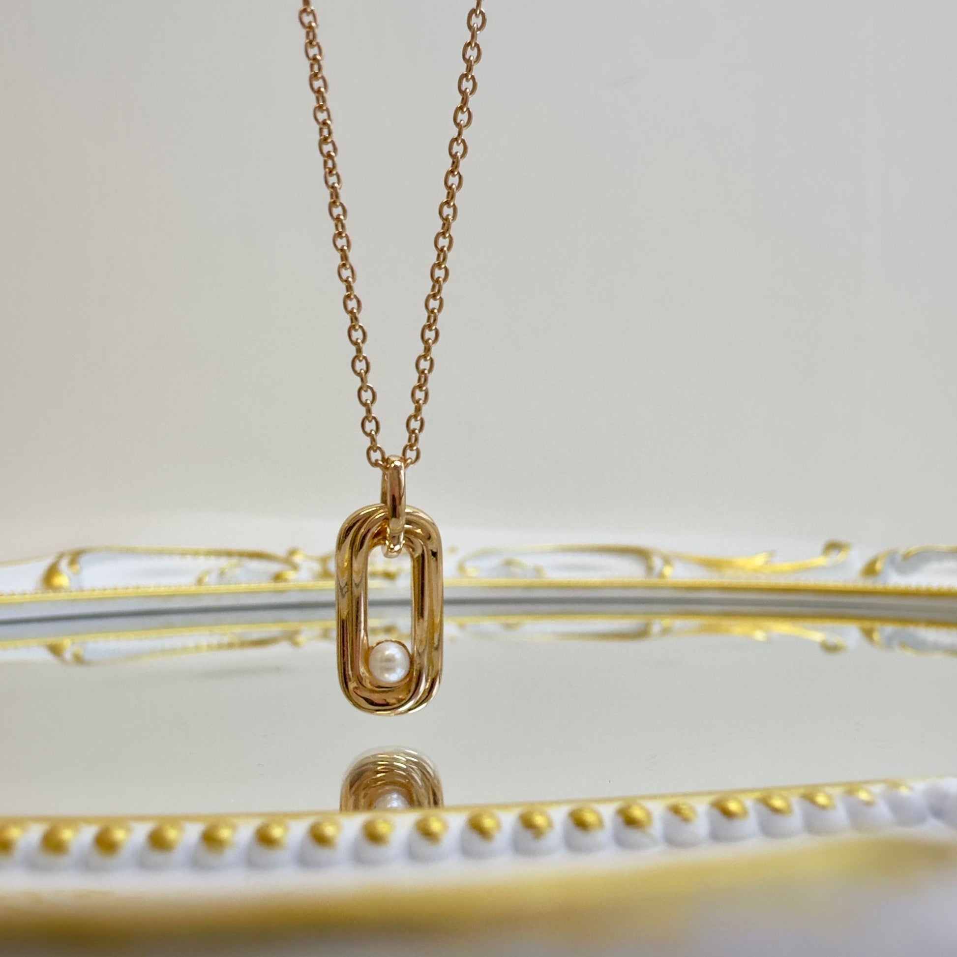 This pendant features a smooth hollow oval frame, capturing a single floating pearl inside — like a tiny universe held in place. Available in both gold and silver tones, this necklace adds a subtle statement to any outfit, whether layered or worn alone.