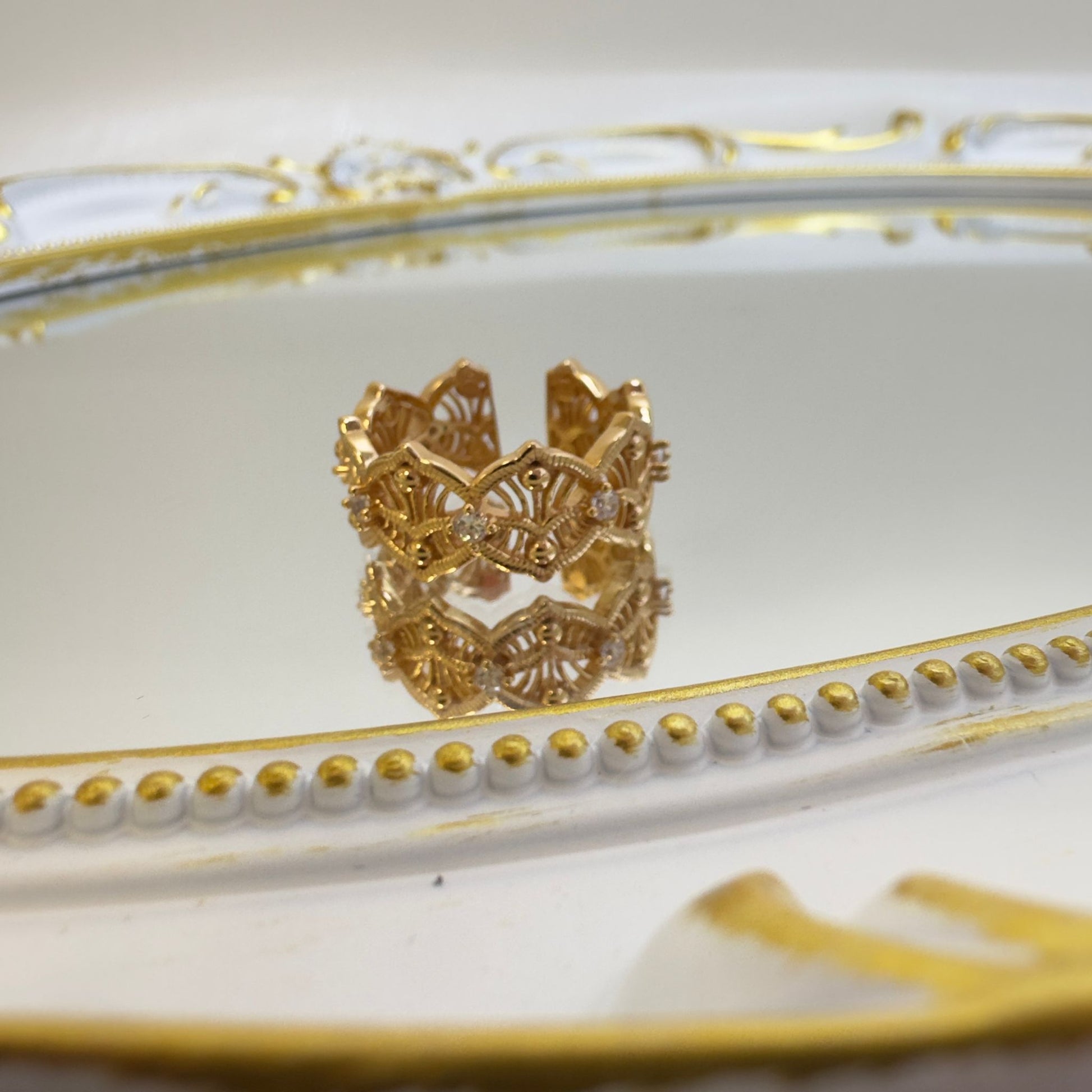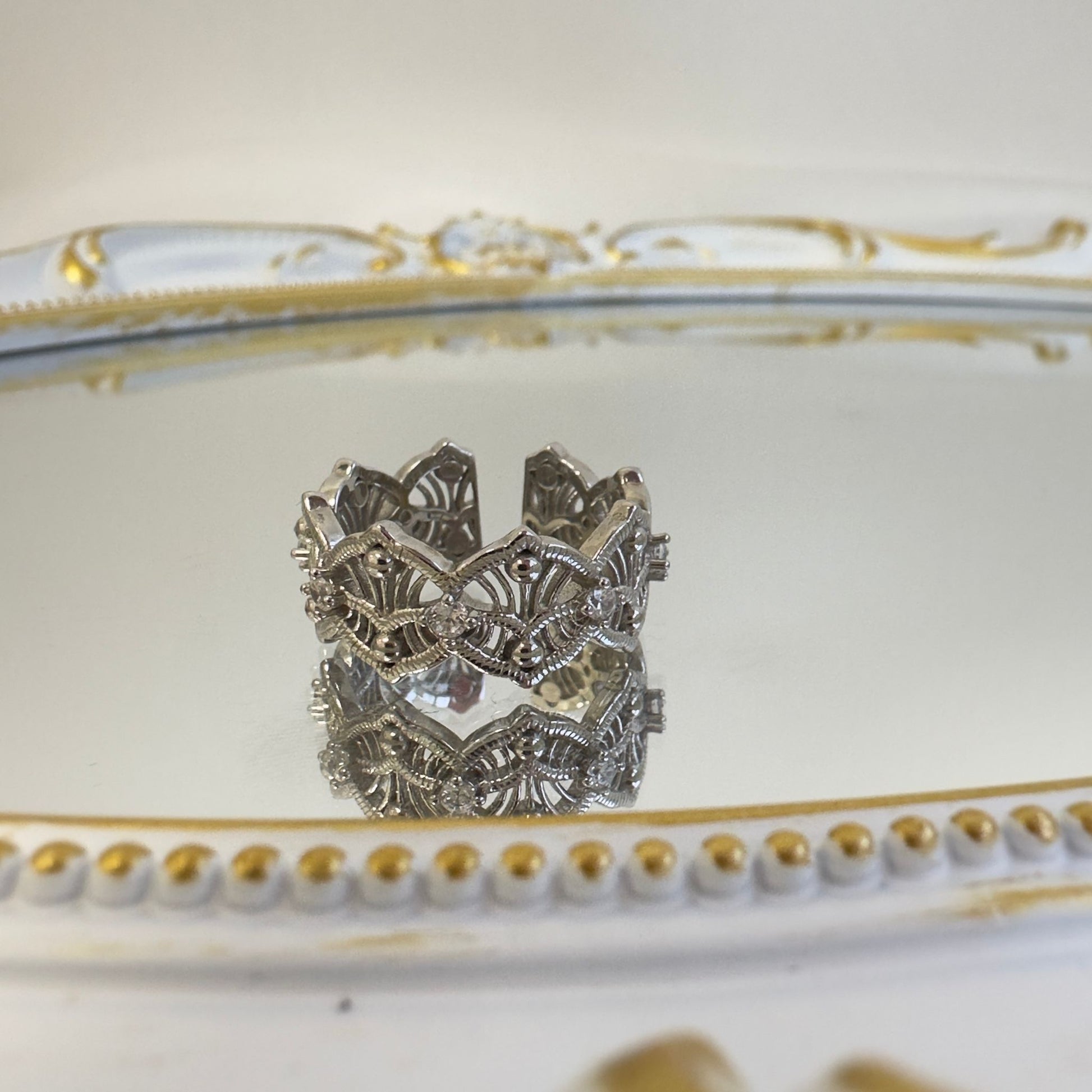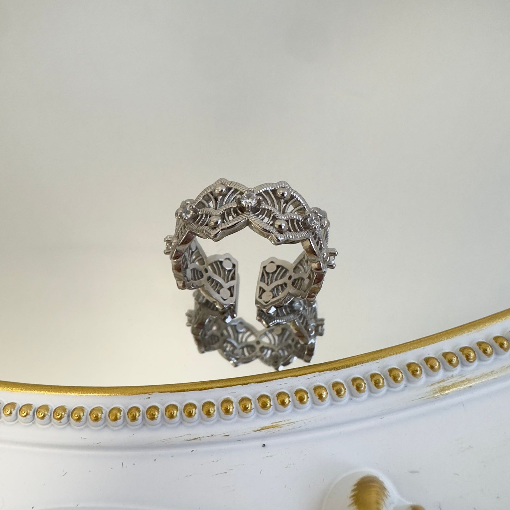 This ring features a beautifully intricate openwork design with vintage-inspired textures and delicate sparkling stones. The wave-like band adds dimension and charm β perfect for styling solo or stacked with your other favorites.
