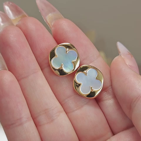 Elegant and timeless, these stud earrings feature a luminous mother-of-pearl clover set in a smooth gold frame. The natural iridescence reflects soft light with every movement, adding a refined glow to your look. Perfect for everyday wear or special occasions, they bring a touch of effortless luxury and feminine.