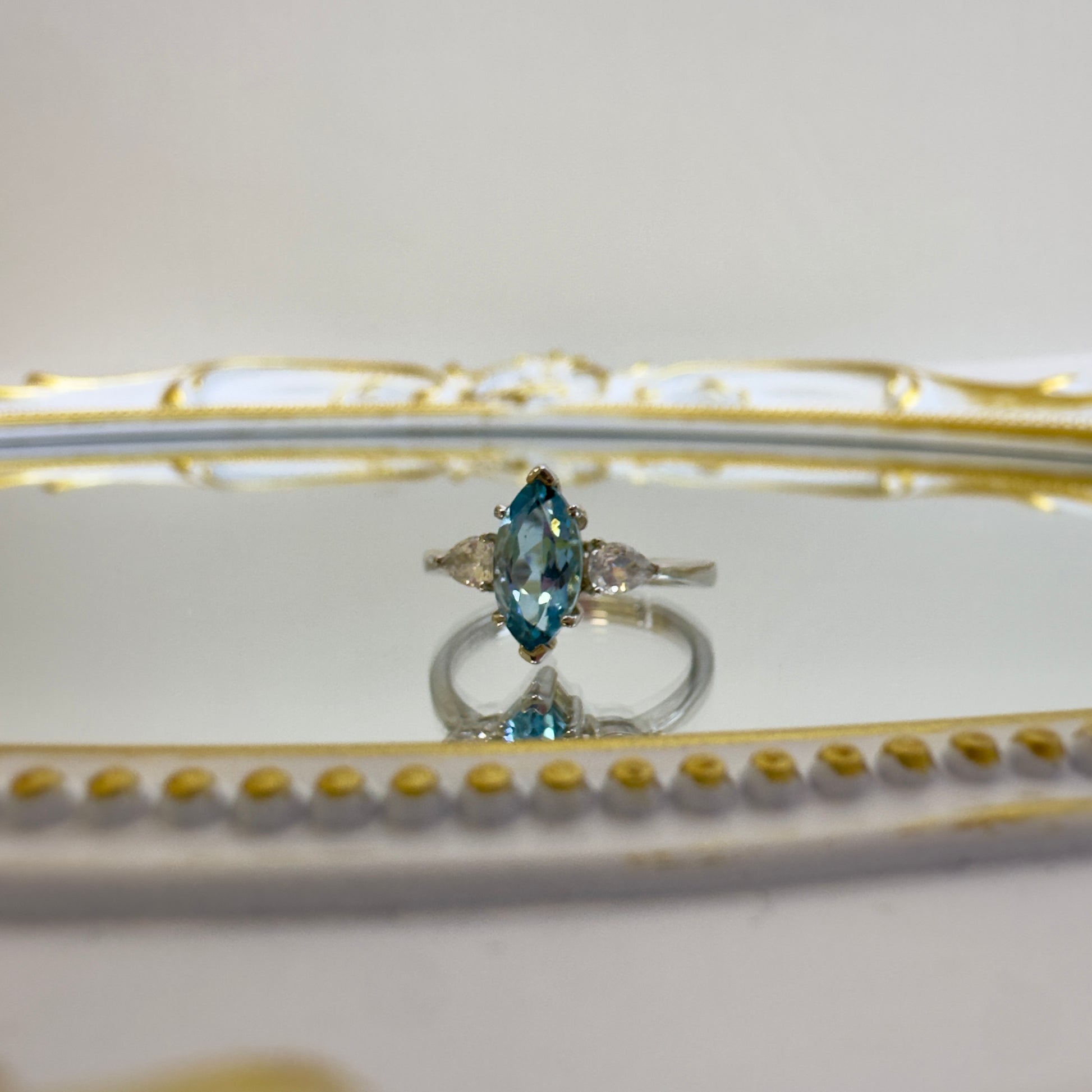 呢隻戒指以橄欖形藍色托帕石為主石,配上925純銀戒身,兩側點綴住閃爍莫桑石,設計纖巧優雅。拉長手指線條,戴上手即時提升氣質。