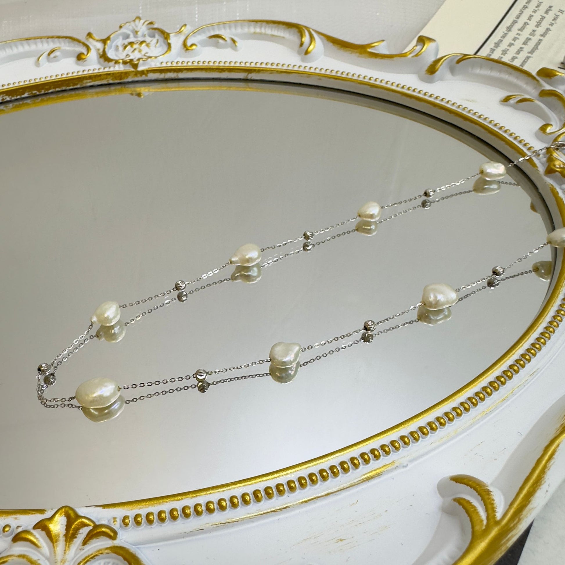 This double-layer necklace features natural baroque pearls, each with its own beautiful, irregular shape — like drops of water or tiny hearts, no two are the same.