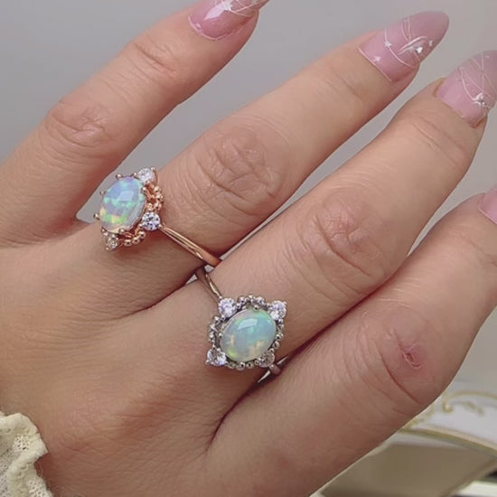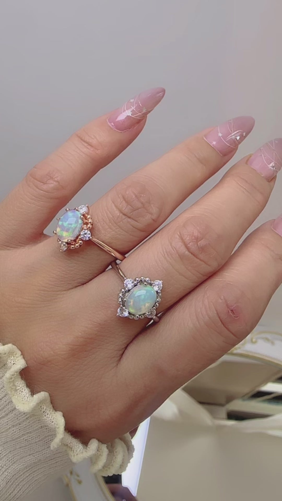 Let your hands tell a story of light and magic with our Ethereal Glow Opal Halo Ring. At the heart of this ring lies a dreamy natural opal—its milky base flashing with delicate rainbow fire—framed by a halo of shimmering cubic zirconia. The double-band design adds a modern touch, while the beaded detailing evokes vintage romance.