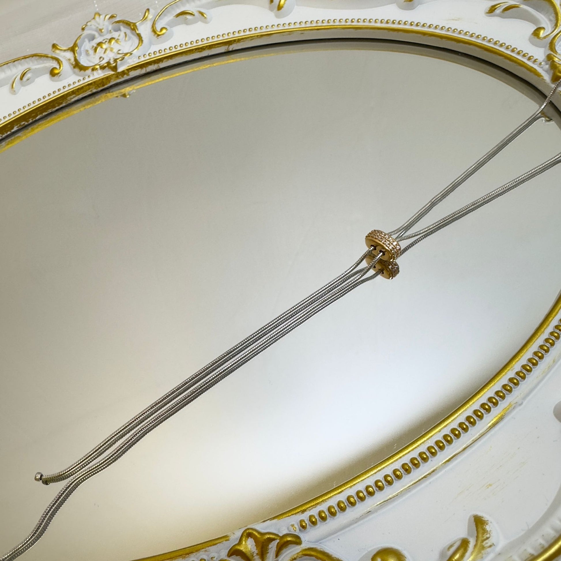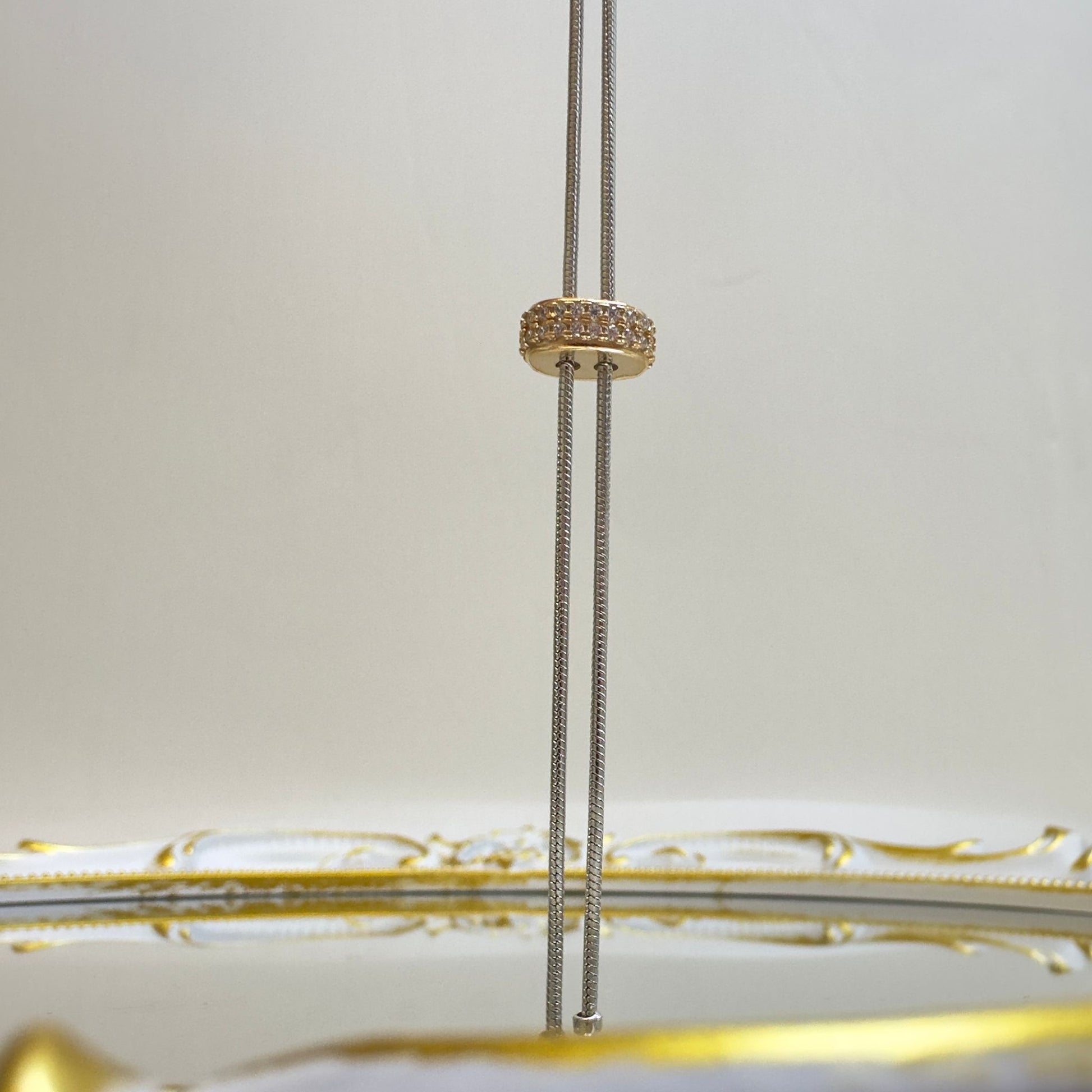 A modern twist on minimal elegance. The Orbit Spark Necklace features a glimmering pavé-set ring charm that gracefully slides along sleek multi-strand snake chains. Available in both gold and silver tones, this versatile piece adds a subtle statement whether worn solo or layered. The sliding mechanism allows you to adjust the focus—center it, tilt it, or stack it—your style, your orbit.