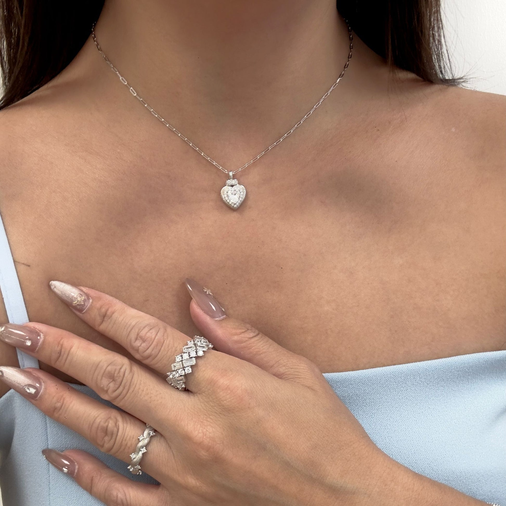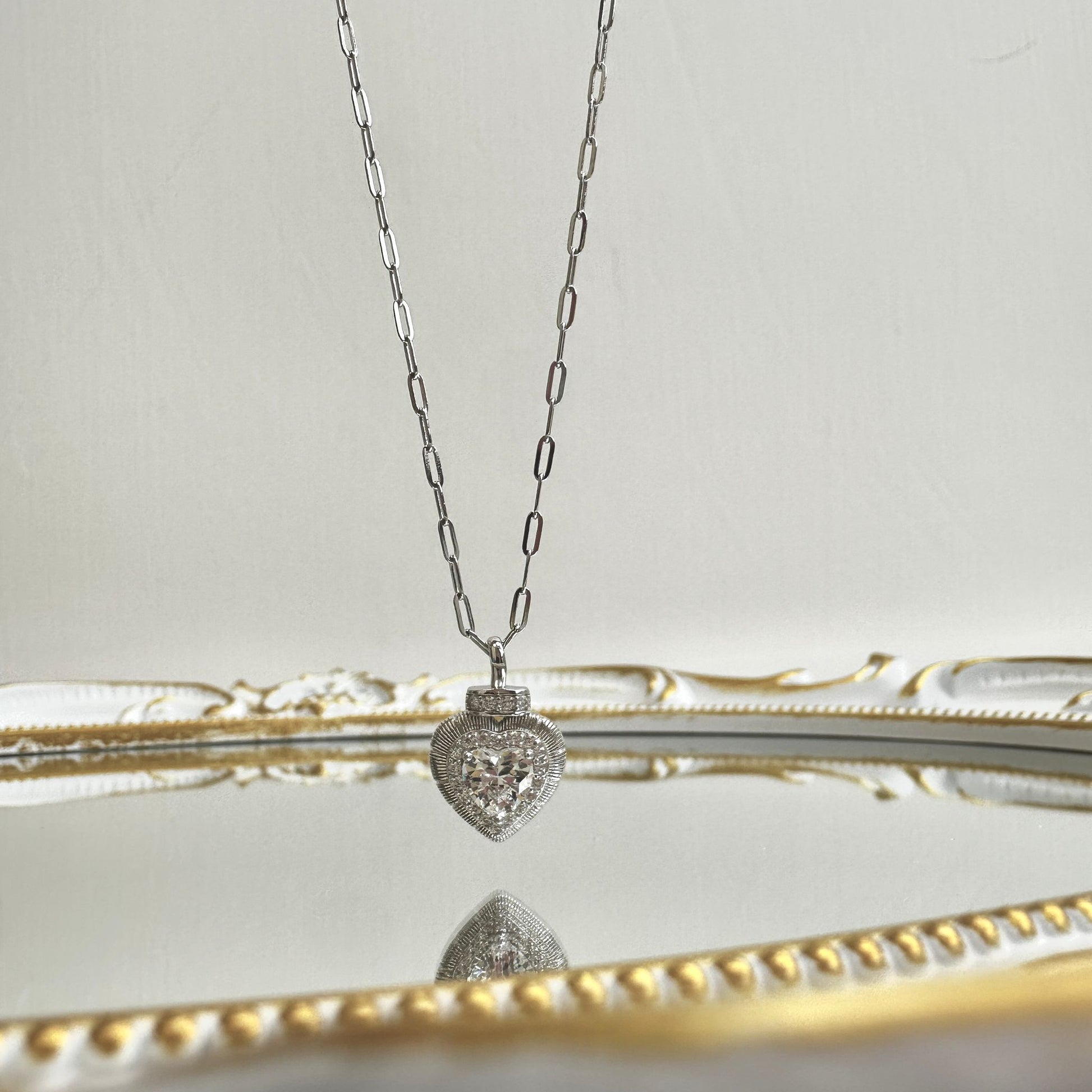 This sparkling heart-shaped pendant is the perfect symbol of love and light. Featuring a brilliant center stone surrounded by a finely detailed milgrain edge and set on a modern paperclip-style chain, it effortlessly blends vintage charm with contemporary flair. Whether it’s a thoughtful gift or a personal keepsake, this necklace adds a graceful, romantic touch to any look — from date nights to everyday elegance.